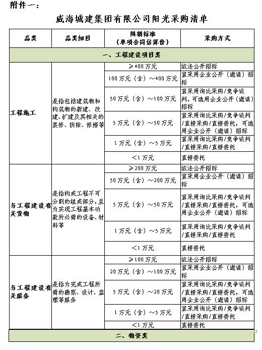 第十七條 本制度規(guī)定的采購(gòu)范圍包括工程建設(shè)項(xiàng)目、物資和社會(huì)服務(wù)的招標(biāo)采購(gòu)(詳見(jiàn)附件一《威海城建集團(tuán)有限公司陽(yáng)光采購(gòu)清單》)。