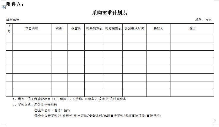 (一)需求部門(mén)(單位)應(yīng)按照要求及時(shí)提報(bào)年度、季度采購(gòu)需求計(jì)劃表。其中: