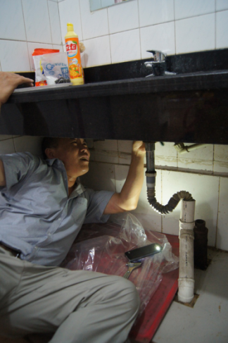 “我們服務搞得好一點,租戶就租得時間長一點,集團的利益就能多保障一點?!?br /> 7月6日下午2時,在順河街一處網(wǎng)點房的洗手間里,54歲的唐建民斜倚在地上,費力地將頭伸入洗手盆的下面,維修壞掉的下水管道。當天,室內(nèi)溫度大約在35攝氏度左右,狹小無窗的洗手間溫度更高。在手機手電筒微弱的光線下,唐建民認真地工作著,難聞的味道與難耐的高溫仿佛對他沒有影響——如果忽略不停滴落的汗水的話。